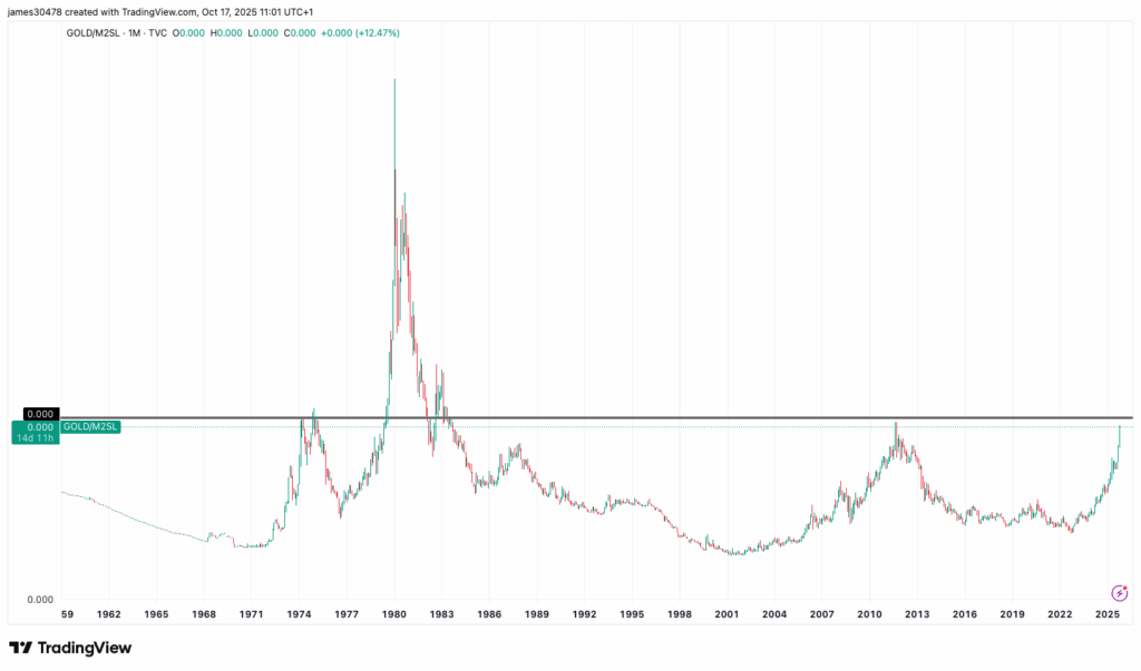 از کف سال ۲۰۲۲ تاکنون، طلا نسبت به M2 تقریباً ۱۵۰٪ رشد کرده است. با این حال، اکنون به سطوح تاریخی مهمی نزدیک می شود که آخرین بار در اوج های ۲۰۱۱ و ۱۹۷۴ مشاهده شده بودند. این موضوع می تواند نشان دهنده نزدیک شدن موج صعودی فعلی به قله باشد؛ اما از سوی دیگر ممکن است نشان دهد بازار گاوی هنوز راه زیادی در پیش دارد. برای مثال در دوره رکود تورمی دهه ۱۹۷۰، طلا پیش از رسیدن به اوج نهایی خود، در مقابل عرضه پول M2 حدود ۱۸۰٪ رشد اضافی ثبت کرد.